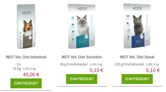 Allen Hunde- und Katzenbesitzern schenken wir zum Beispiel bis zu 75 % Preisnachlass beim Kauf von ausgewählter Nahrung der WDT Vet Diets.