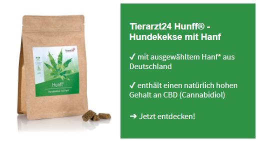 Tierarzt24 Hunff® – Hundekekse mit HanfBei der Herstellung von Tierarzt24 Hunff® wird ausschließlich Hanf* von ausgewählten, besonders sonnigen Feldern in Deutschland verwendet. Dadurch weisen die Hundekekse einen natürlich hohen Gehalt an Cannabidiol auf. Und sie sind besonders lecker!