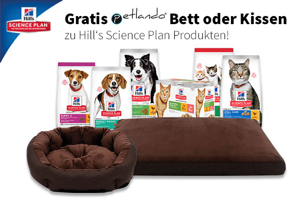 Überzeugen Sie sich selbst und erhalten Sie beim Kauf von Hill’s Science Plan Futtermitteln ein Bett oder Kissen von Petlando in verschiedenen Größen gratis dazu! Nicht nur Ihr Hund, auch Ihre Katze wird sich über ihren neuen Schlafplatz freuen.