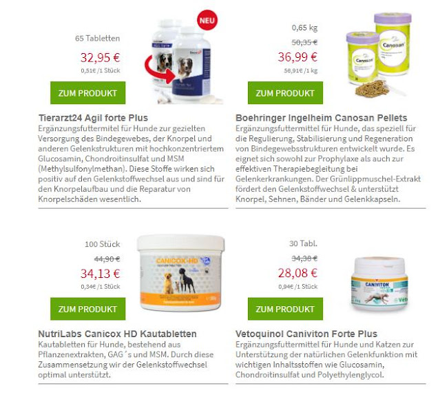 Untenstehend haben wir Ihnen einige Diät- und Ergänzungsfuttermittel aufgeführt, die die Gelenke Ihres Hundes vorbeugend sowie im Falle eines Verschleißes optimal unterstützen und ein Fortschreiten der Krankheit verlangsamen können.