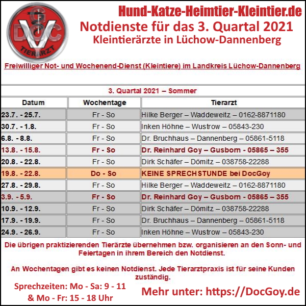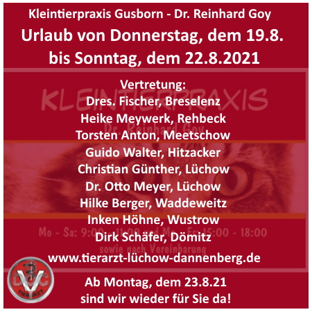 Leider hat auch die Kollegin Bruchhaus in Dannenberg zu dieser Zeit Ihren Sommerurlaub, sodass Sie in Notfällen für diese Tage einen der folgen Tierärzte anrufen sollten: